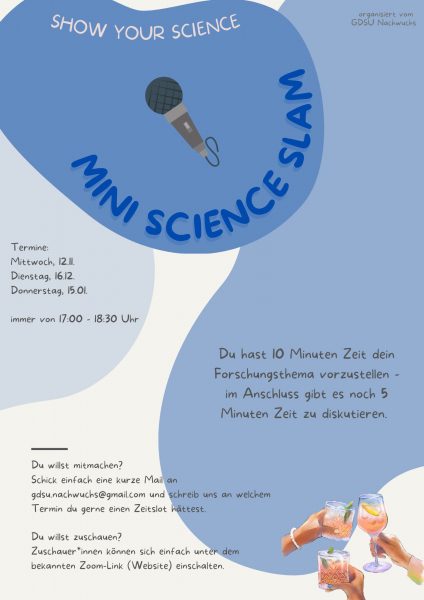 Du hast Lust, deine Komfortzone zu verlassen und deine Forschung, egal, ob dein Dissprojekt oder etwas Anderes, vorzustellen? Dann bist du hier genau richtig, melde dich gerne bei uns und mache in lockerer Atmosphäre mit - ganz ohne Wertung, denn alle, die mitmachen werden als Gewinner:in gekürt! :-)